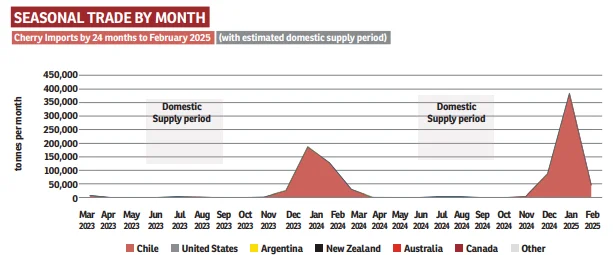 Una de las particularidades de la producción de Cerezas en Chile es su amplia zona de producción, desde la latitud 32º (Ovalle) hasta la latitud 46º (Chile Chico). No obstante lo anterior, el 80% del volumen de cerezas se produce en la Región de O’Higgins y Región del Maule con volúmenes de fruta concentrada desde la segunda quincena de diciembre a primera semana de enero.
