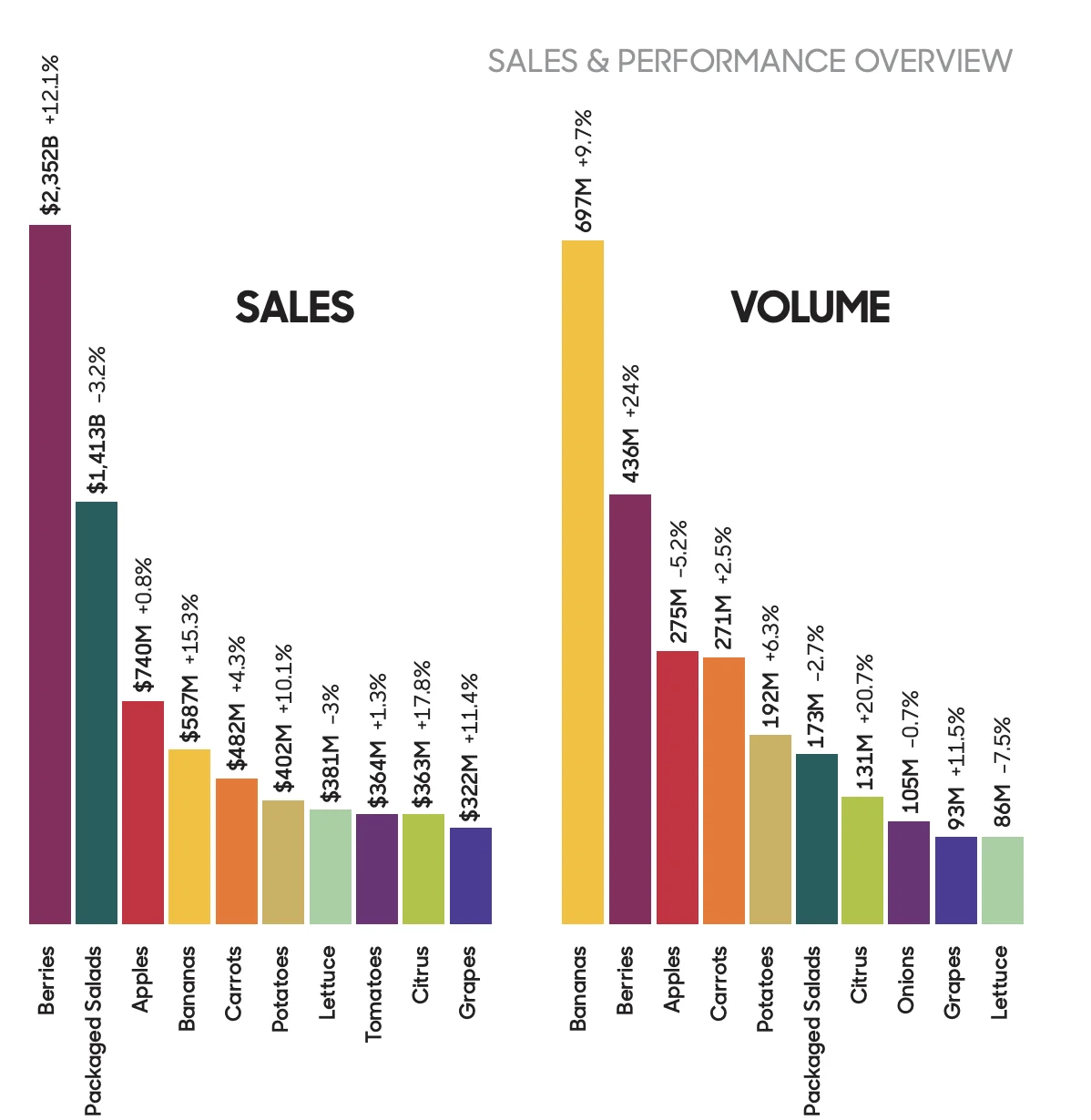 El informe identifica a las berries (fresas, arándanos, frambuesas y moras) como la categoría líder en ventas por cuarto año consecutivo, generando casi 2.400 millones de dólares (un aumento del 12,1% respecto al año previo). Por otro lado, las bananas (plátanos) se mantienen como el producto más vendido en términos de volumen, con 697 millones de libras despachadas.