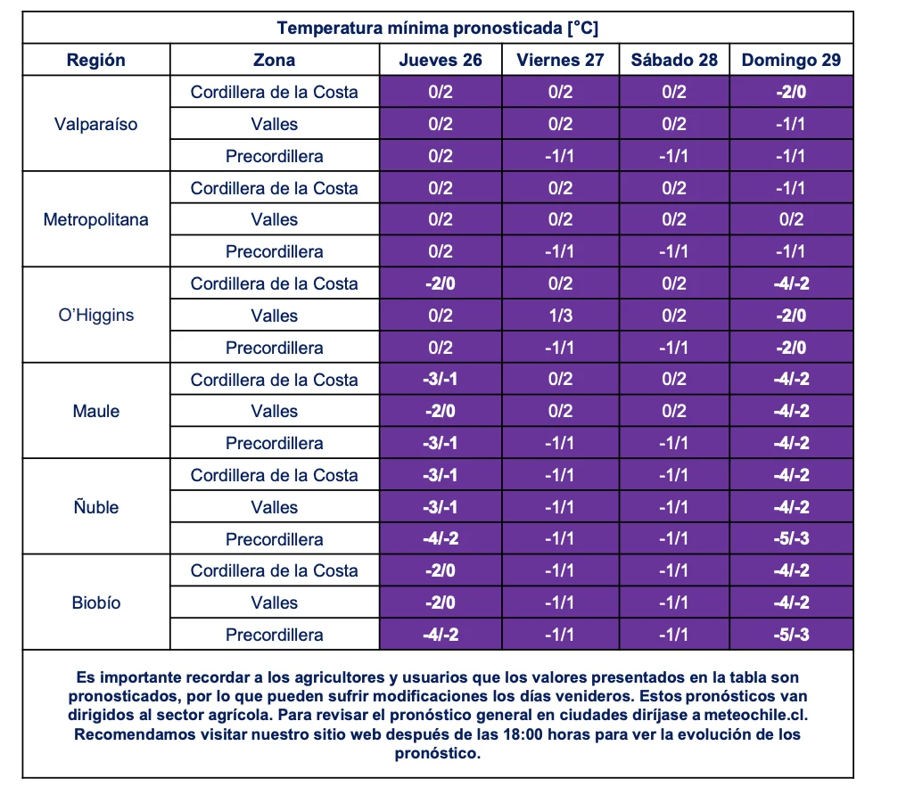 La Dirección Meteorológica de Chile emitió una «Advertencia Agrometeorológica de Heladas» para las regiones de Valparaíso al Biobío. Ello, debido a la presencia de una masa de aire fría que favorecerá la ocurrencia de heladas en las mencionadas regiones  y para los días y en los sectores que se detallan en la siguiente tabla: