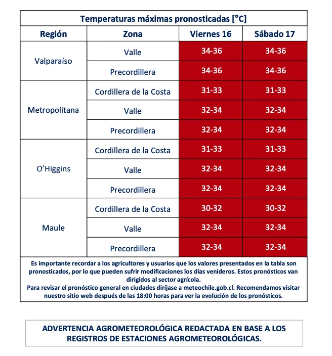 De acuerdo a la última Advertencia Agrometeorológica de la Dirección Meteorológica de Chile, DMC, producto de circulación ciclónica en superficie, reforzada por un flujo del este se espera un aumento en las temperaturas máximas entre los días viernes 16 y sábado 17 de enero de 2026, entre las regiones de Valparaíso y Maule, en los sectores que se detallan a continuación: