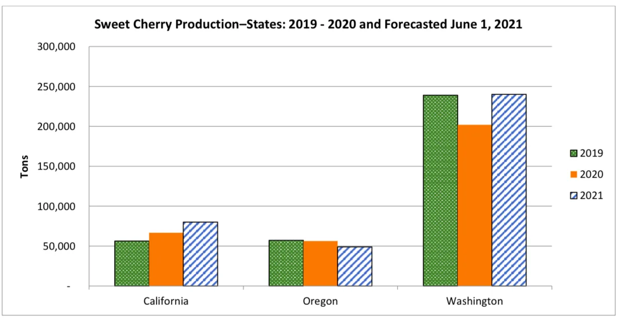 Estas condiciones climáticas han afectado la cosecha de cerezas, luego que el último pronóstico de producción del USDA mostrara una producción superior a 2020, pero un 6% menos de lo que vieron los productores en 2019. Al respecto, USDA ha dicho que las variedades de floración tardía estaban muy por detrás del resto de la cosecha, lo que ya está dando lugar a rendimientos más bajos.