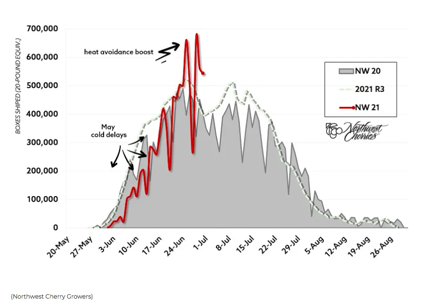Los transportistas señalaron que la ola de calor podría reducir un poco el volumen de la cosecha y retrasar el calibrado temporalmente, pero expresaron su confianza en que habrá muchas cerezas de Washington de alta calidad para que los minoristas las promocionen en julio y agosto. Algunos incluso están hidroenfriando cerezas y tomando otras medidas para eliminar el calor de la fruta, así como también están utilizando tecnología de clasificación avanzada para exportar sólo fruta fuerte y dura al mercado.