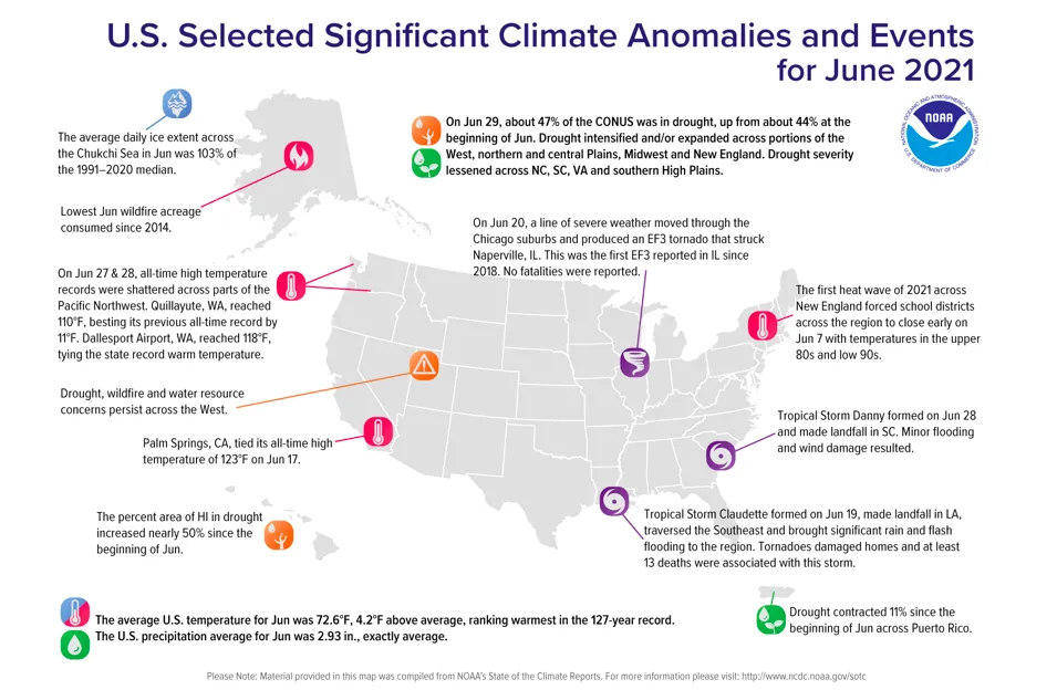 El calor y las condiciones extremas de sequía también están alimentando incendios forestales, además de hacer que los huertos y los trabajadores agrícolas cambien sus horarios para combatir las altas temperaturas. Según la Administración Nacional Oceánica y Atmosférica (NOAA) el mes pasado fue oficialmente el junio más caluroso registrado.