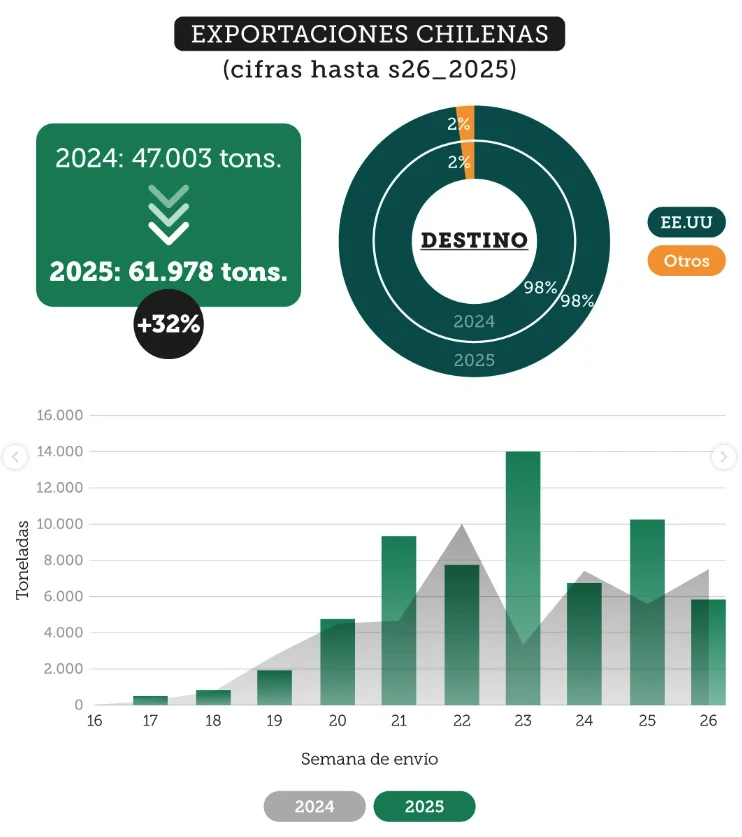 A la fecha (semana 26-2025), se han exportado cerca de 62 mil toneladas a nivel global , lo que representa un aumento del 32% en comparación con la campaña anterior. Del volumen total, Estados Unidos es el destino principal, concentrando el 98% de los envíos.