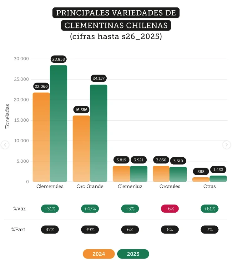 Durante la semana 26, Decofrut informa del fin de la cosecha de clementinas a lo lardo del país, destacando que esta temporada, la fruta presentó, en general, buenos parámetros de calidad, destacando una óptima relación entre sólidos solubles y acidez, junto con una adecuada productividad.
