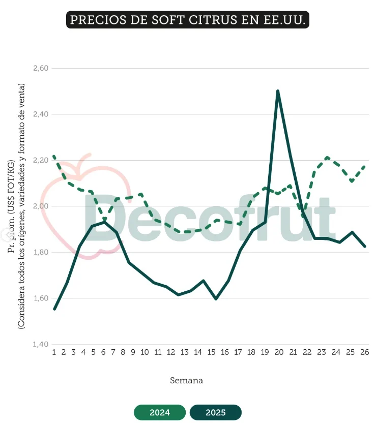 Este año, el mercado de soft citrus en Estados Unidos ha mostrado menos dinamismo , con una demanda moderada, provocando que las cotizaciones sean menores que el año anterior (-10% en promedio lineal anual).
