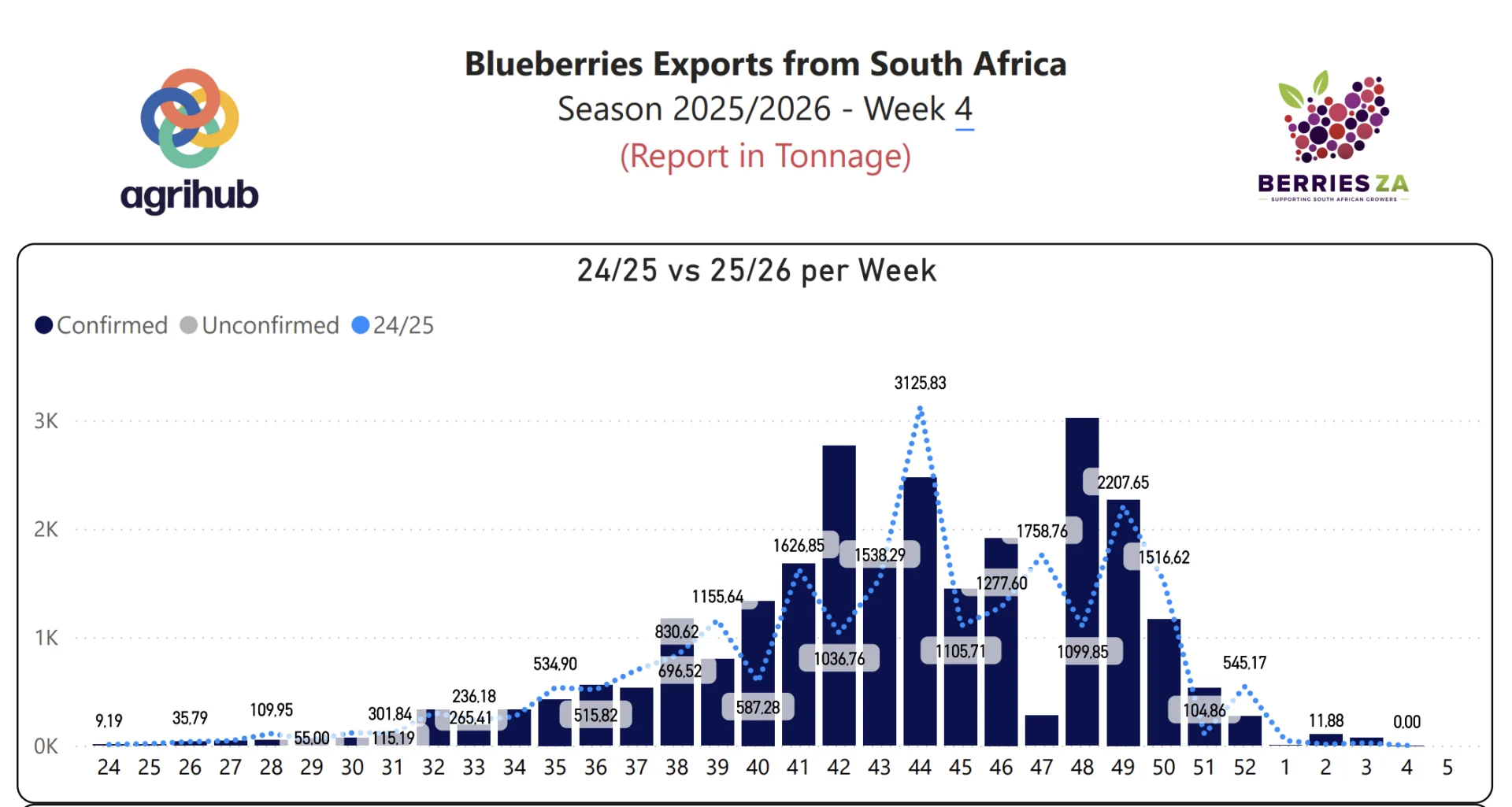 La industria sudafricana del arándano muestra un sólido desempeño en la presente temporada. Según el informe más reciente de Berries ZA, las exportaciones totales acumuladas hasta la Semana 4 , alcanzaron las 25.756,52 toneladas, lo que representa un incremento del 13,7% en comparación con las 22.654,41 toneladas registradas en el mismo periodo del ciclo anterior (24/25).