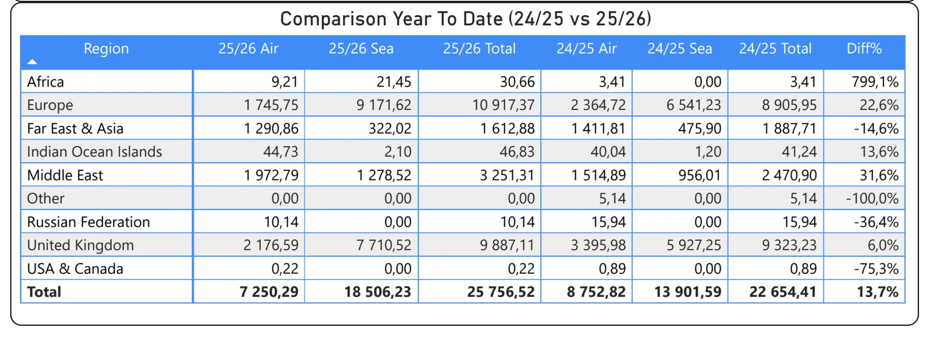 Europa (continente): Ha recibido 10.917,37 toneladas, un aumento del 22,6% respecto a la temporada pasada. Dentro de esta región, los Países Bajos destacan con una recepción de 9.417,01 toneladas.