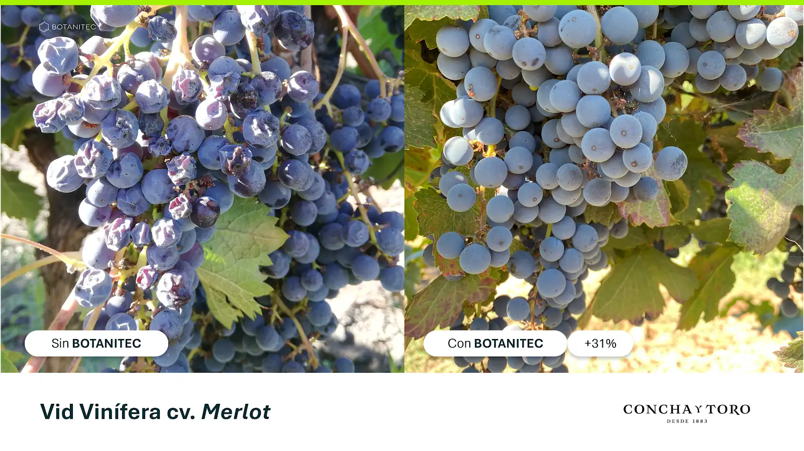 Durante la temporada 2023-24 se obtuvieron resultados consistentes en las diferentes cepas evaluadas: Sauvignon Blanc, Cabernet Sauvignon y Merlot. Entre ellos destacó en la variedad Cabernet Sauvignon (campo Tocornal) una deshidratación de racimo un 80% menor; y en Merlot (campo Tocornal) un aumento del rendimiento de un 31%, con una evidente disminución de la deshidratación de racimo, como se evidencia el a fotografía a continuación.