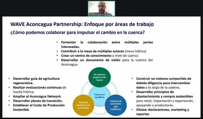¿Por qué enfocarse en el Valle del Aconcagua en Chile?, Puebla señala que es una de las regiones agrícolas más importantes de Chile, abasteciendo a los mercados del Reino Unido y la Unión Europea. Desde 2010, Chile ha experimentado sequías prolongadas que, junto al uso del agua han incidido en la disponibilidad hídrica de la cuenca. Es por esto que se creó el Aconcagua Network y la Alianza WAVE Aconcagua, conectando a públicos y privados en torno a un objetivo común: contribuir al equilibrio en la cuenca; colaborando en la gestión y aportando conocimientos técnicos.