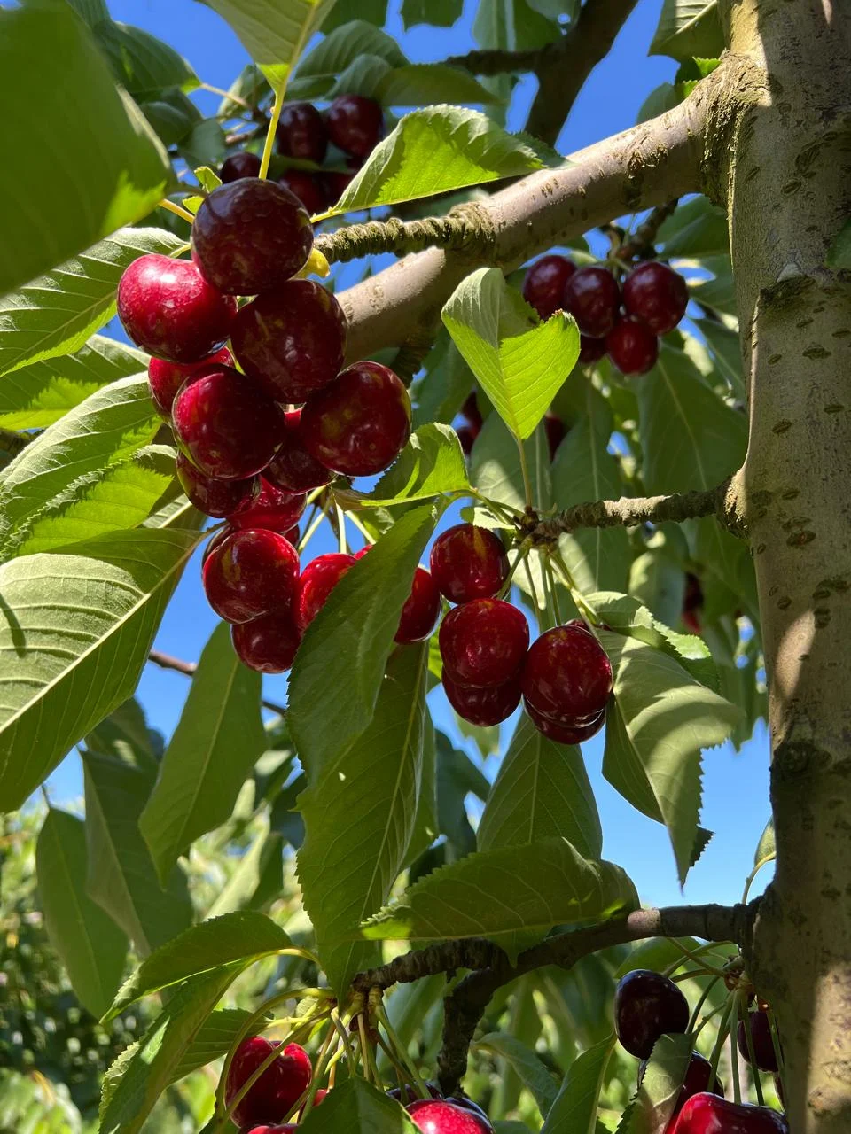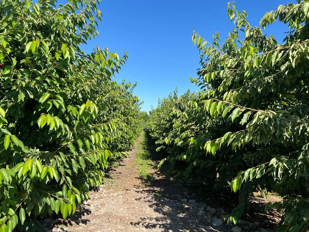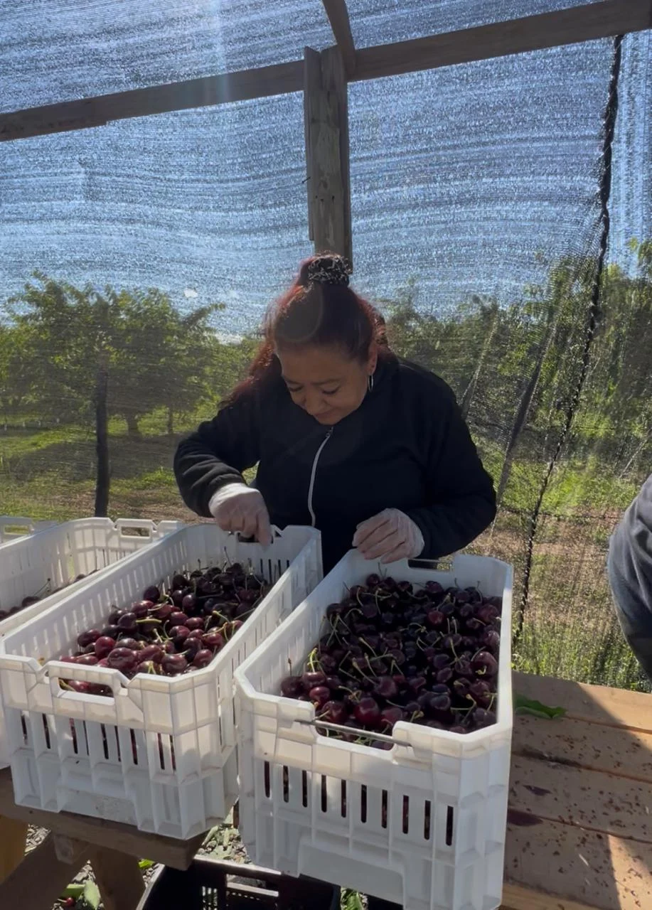 “Este es un huerto de cerezas de 4 hectáreas en este predio, con variedades Santina, Lapins y Bing”, explica Sebastián. En total, la empresa maneja 8 hectáreas en dos campos contiguos. La Santina –la variedad más temprana del proyecto– es la que en estos momentos están terminando de cosechar, gracias al apoyo de mano de obra boliviana y chilena, especialmente a cargo de mujeres.