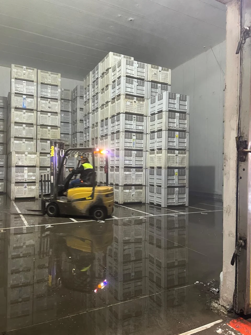 Posteriormente, las cajas pasan al paletizado, se someten a un enfriado en túneles de aire forzado hasta acercarse a 0 °C y se llevan a la zona de acopio en cámaras de frío, donde esperan el despacho. Cuando llega el pedido comercial, esa fruta se carga en un contenedor y se embarca, previa inspección del SAG según los protocolos fitosanitarios de cada país de destino.