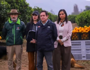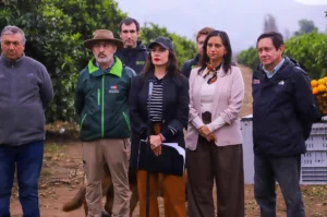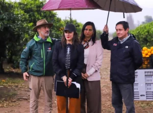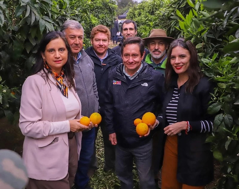 Hasta un huerto de naranjas de exportación del Fundo Sociedad Agrícola Famosa en Curicó llegaron la Ministra de Agricultura, Ignacia Fernández; la Ministra de la Secretaria General de Gobierno, Camila Vallejo, el Director Nacional del SAG, José Guajardo; el gerente general de Frutas de Chile, Miguel Canala-Echeverría, y la Directora Ejecutiva del Comité de Cítricos de Frutas de Chile, Monserrat Valenzuela, quienes fueron recibidos por el Encargado del Programa de Cítricos de Gesex, Gonzalo Pedreros, el productor del Fundo Sociedad Agrícola Famosa, Alfredo Labbé, y el gerente de producción Empresa Exportadora Gesex, Andrés Undurraga.