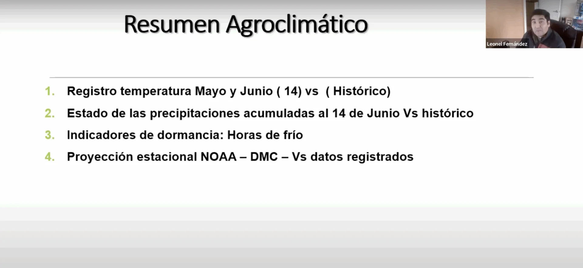 Fernández fue el encargado de presentar los «Indicadores Agroclimáticos: Lo Esperado versus Lo Registrado», ofreciendo una radiografía detallada de lo que los agricultores pueden esperar y cómo pueden prepararse.