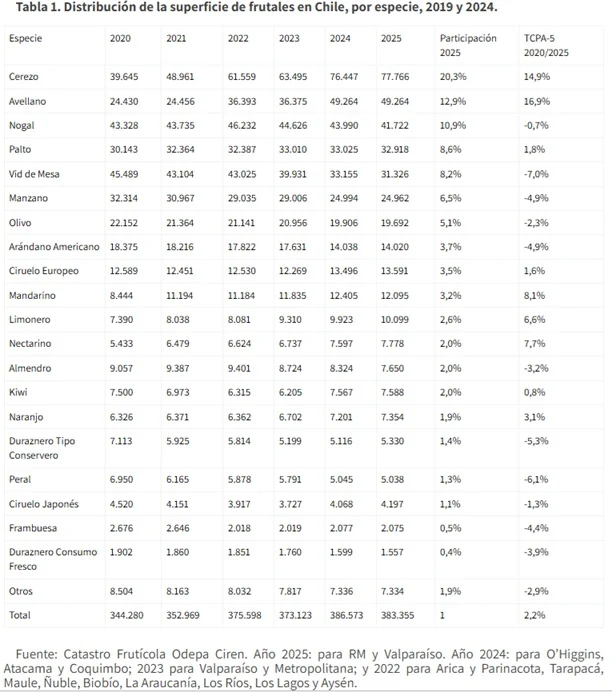Según datos del Catastro Frutícola Odepa-Ciren, la superficie nacional de frutales en 2025 se estima en 383.354,8 hectáreas, y se registra una Tasa Media de Crecimiento Anual (TCPA) de 2,2% para los últimos 5 años (2020-2025). Las principales especies frutales presentes al año 2025 son cerezo, avellano, nogal y palto. En la tabla 1 registra las especies que conforman el 98% de la superficie frutícola nacional. Donde destacan 9 especies con un crecimiento positivo en la superficie plantada los últimos 5 años y 11 cuya superficie desciende.