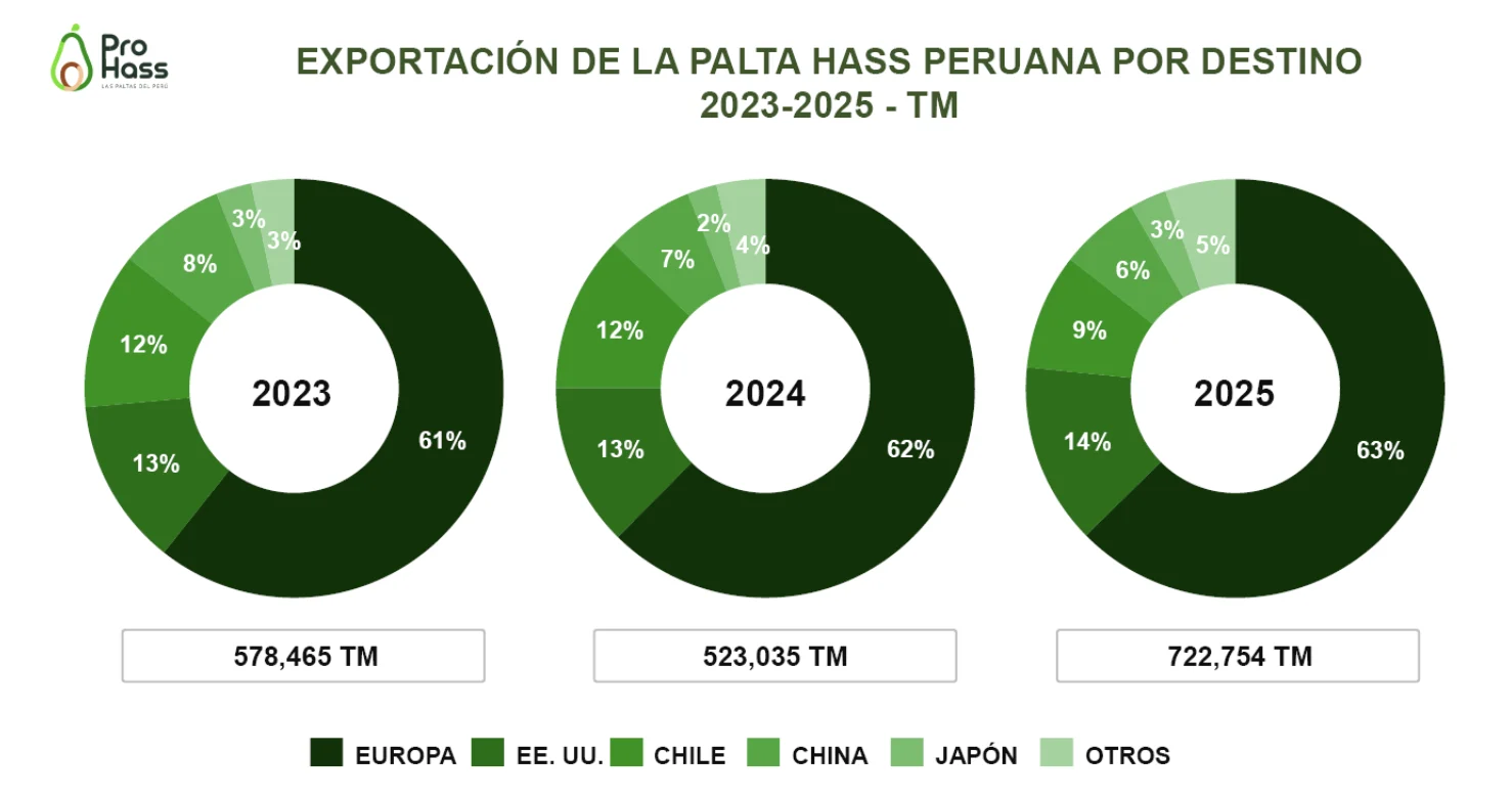 Con un volumen total de 722.754 toneladas exportadas, el sector alcanzó un incremento del 38% en comparación con 2024. Este hito no solo representa una recuperación contundente tras los embates climáticos del año anterior, sino que supera con creces el récord histórico establecido en 2023. Actualmente, la palta peruana llega a 70 mercados globales, consolidando su liderazgo especialmente en Europa, donde concentra el 62,6% de sus envíos y posee una participación del 45% en el consumo de la Unión Europea.