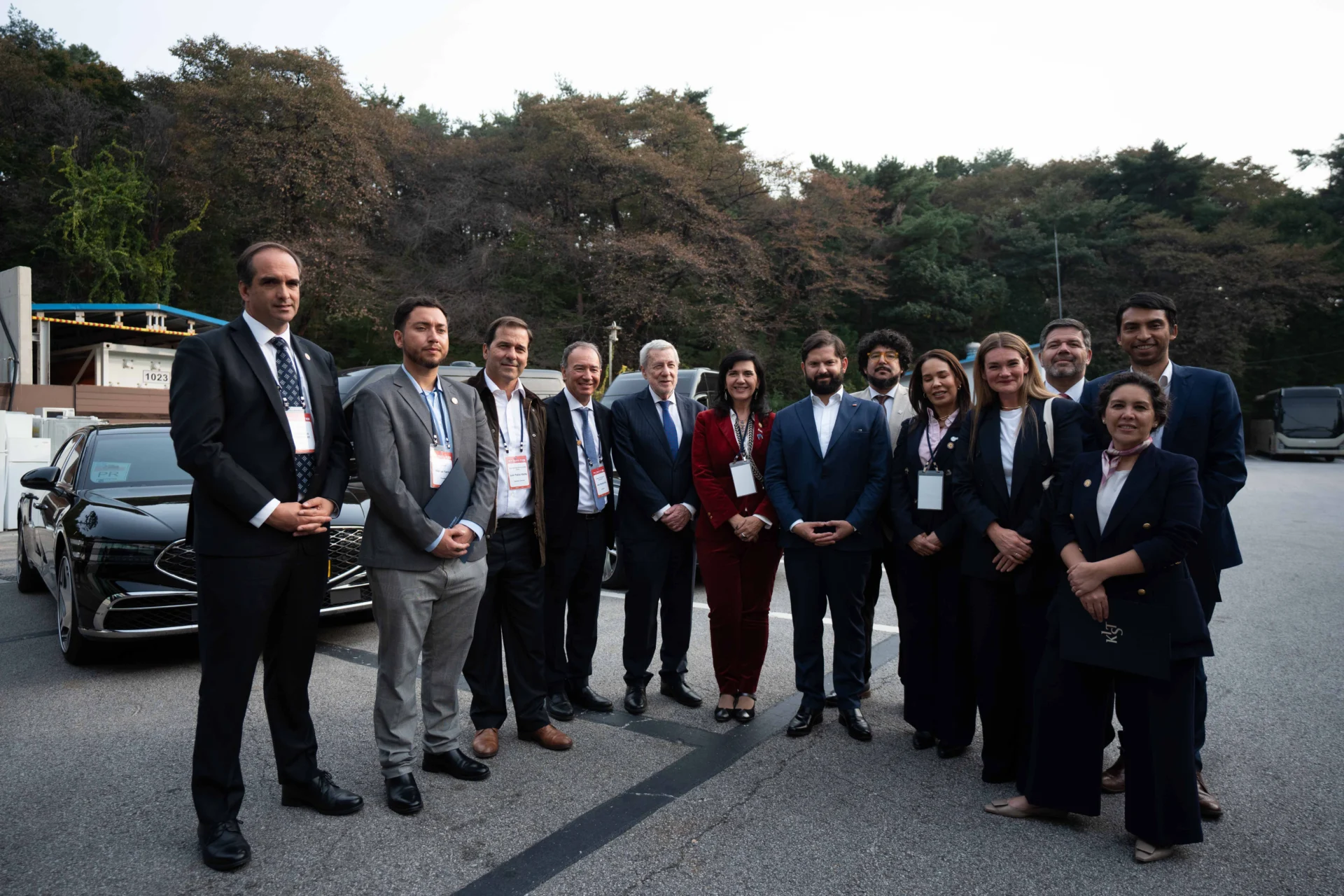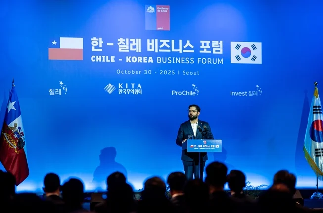 El Presidente de la República, Gabriel Boric Font, encabezó el Seminario Empresarial Chile-Corea 2025, junto al ministro de Relaciones Exteriores, Alberto van Klaveren; el director de ProChile, Ignacio Fernández; la directora de InvestChile, Karla Flores; el presidente de Frutas de Chile, Iván Marambio; y el presidente de la Asociación Internacional de Comercio de Corea (KITA), Jin Sik Yoon.