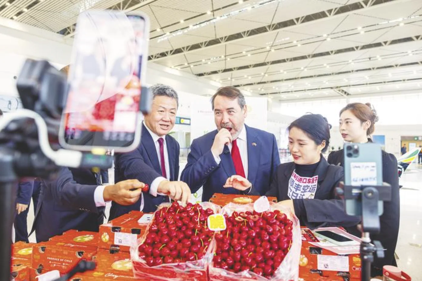 Embajador de Chile en China, Pablo Arriarán Ahumada  (centro), presentando cerezas chilenas a los internautas a través de una transmisión en vivo desde el Aeropuerto Internacional de Ezhou Huahu . (Foto: Hubei Daily / Xue Ting)